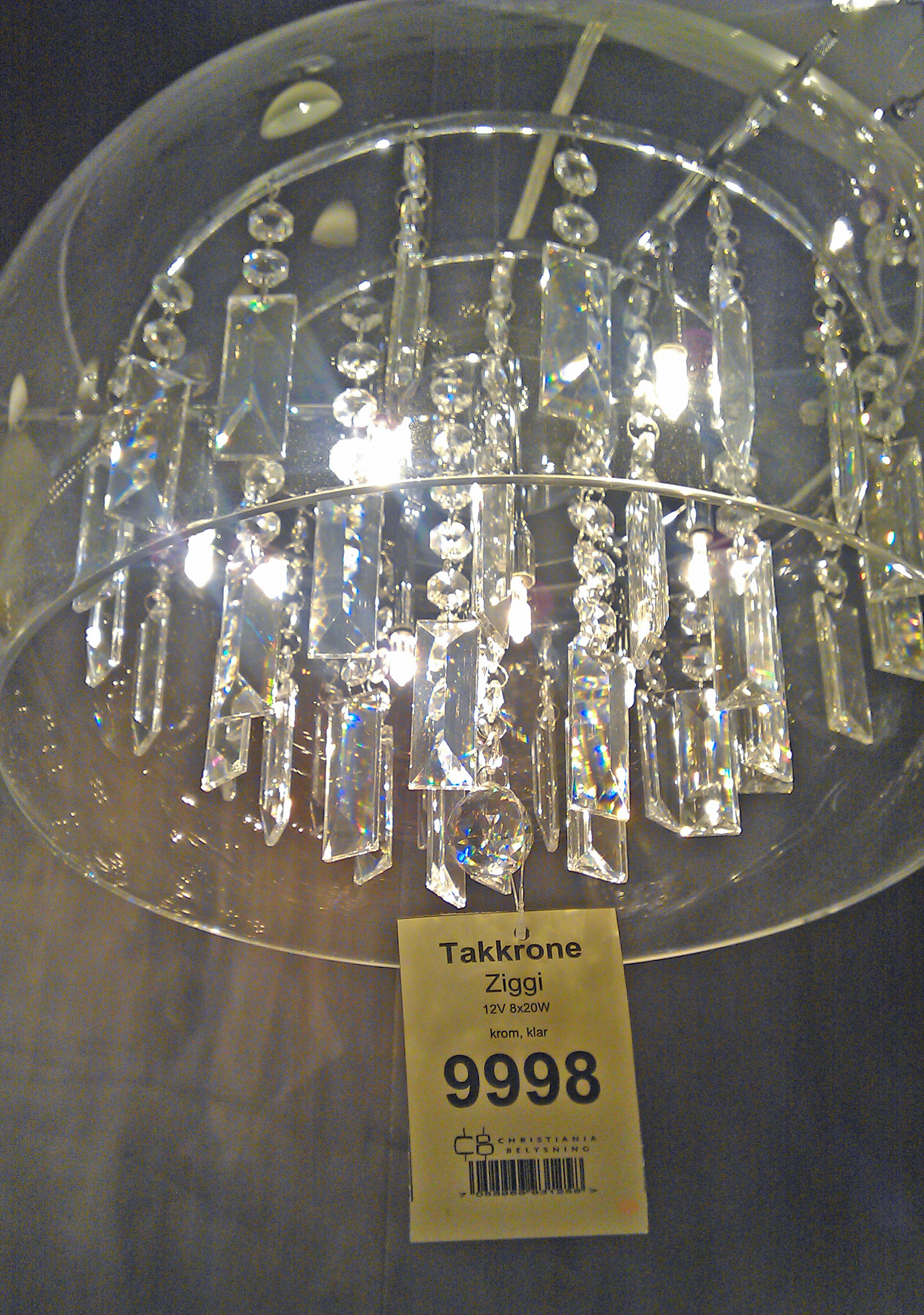 1. Kanskje den er dyrere, men den ser jammen finere ut også. Er vel kanskje ikke krystall i den billige. Har vært å sett på den til 9998,- selv. Den er knall fin. Det er ofte tilbud på christiania belysning, så er du der på rett tid så kan du være heldig å få den på 20 – 40 % 😉