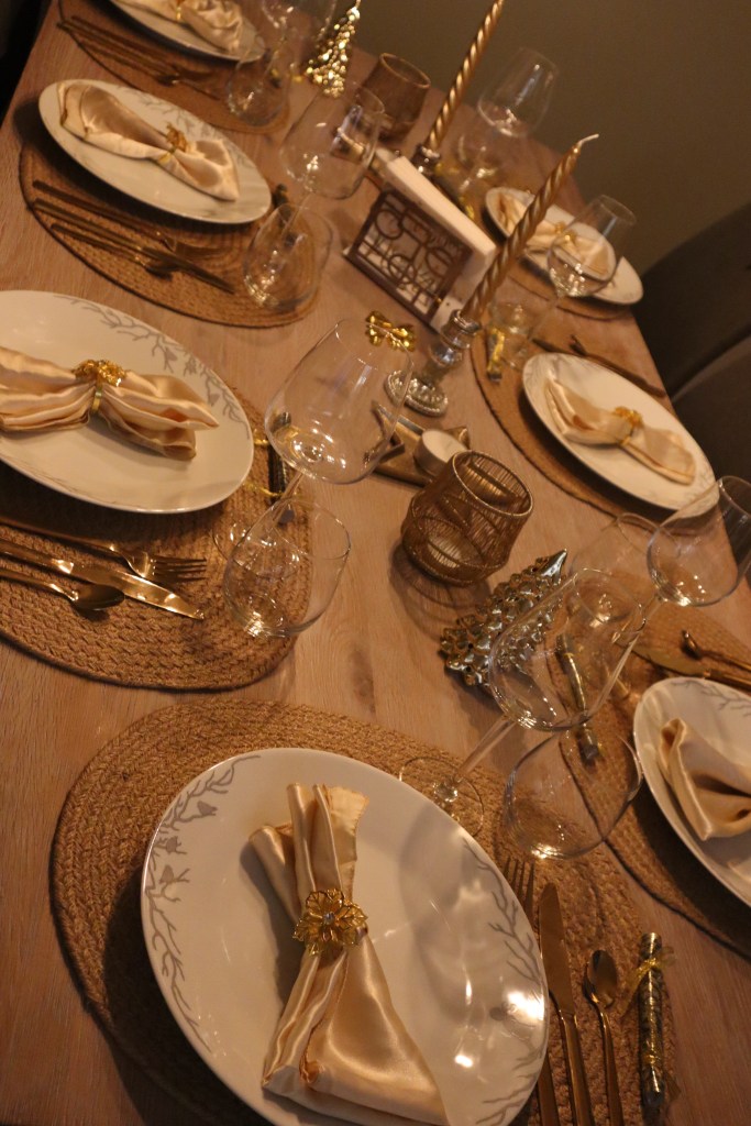 Et nydelig dekket bord og så deilig mat som ble servert. Vi var så heldige å bli invitert til våre nære og kjære, og med en herlig, rolig stemning. Hyggelige samtaler om året som har gått og om våre framtidsplaner.