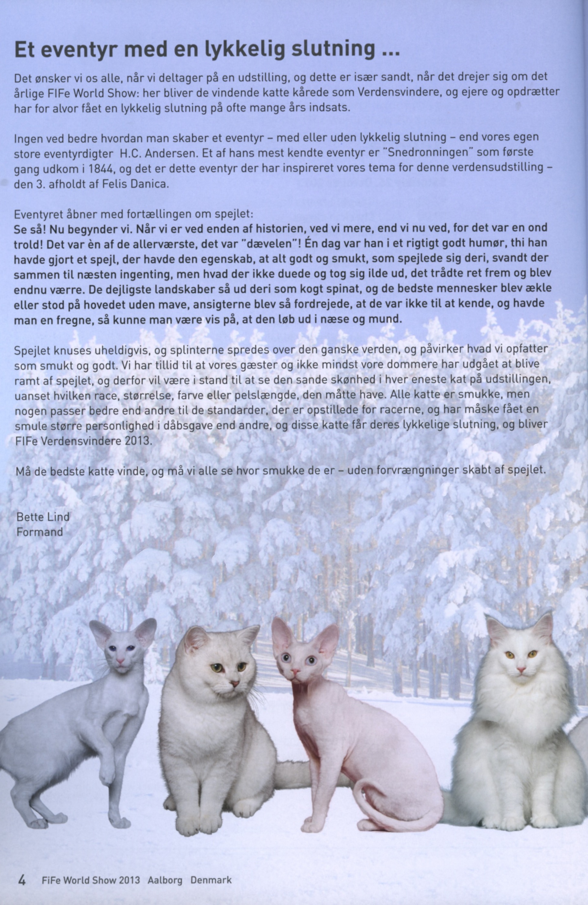 Denne utstillingen var for meg et eventyr, og et minne for livet. En utstilling som mange frivillige i det danske forbundet Felis Danica hadde jobbet svært lenge og mye med for å få det til å bli slik det ble. Idéen med Snedronningen og vinter og is synes jeg ble svært delikat og fint.