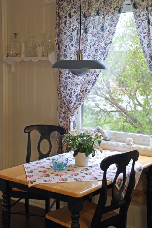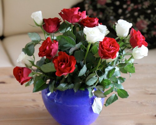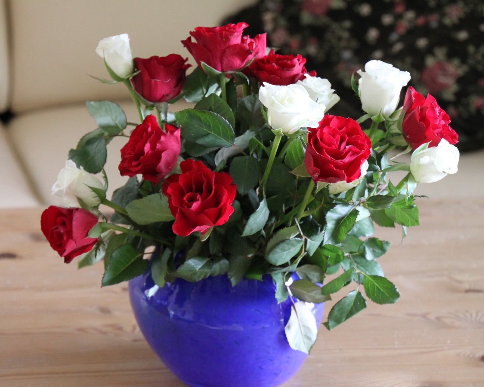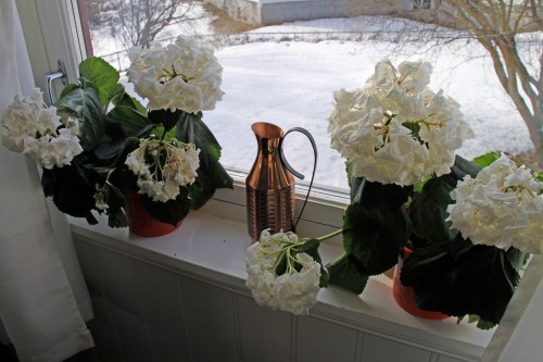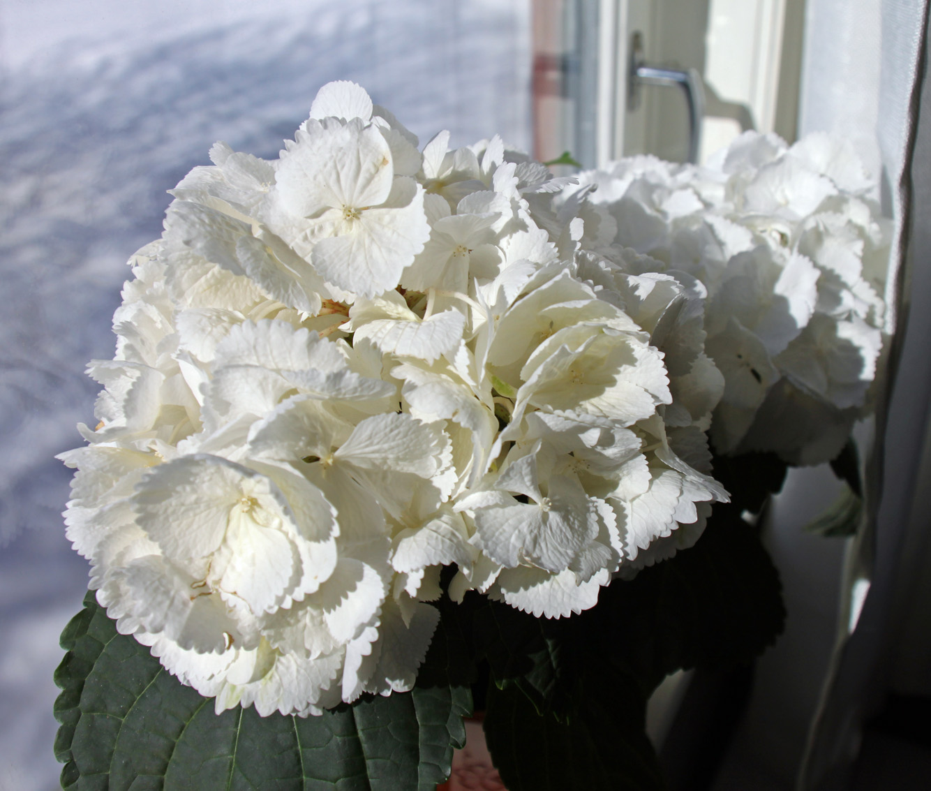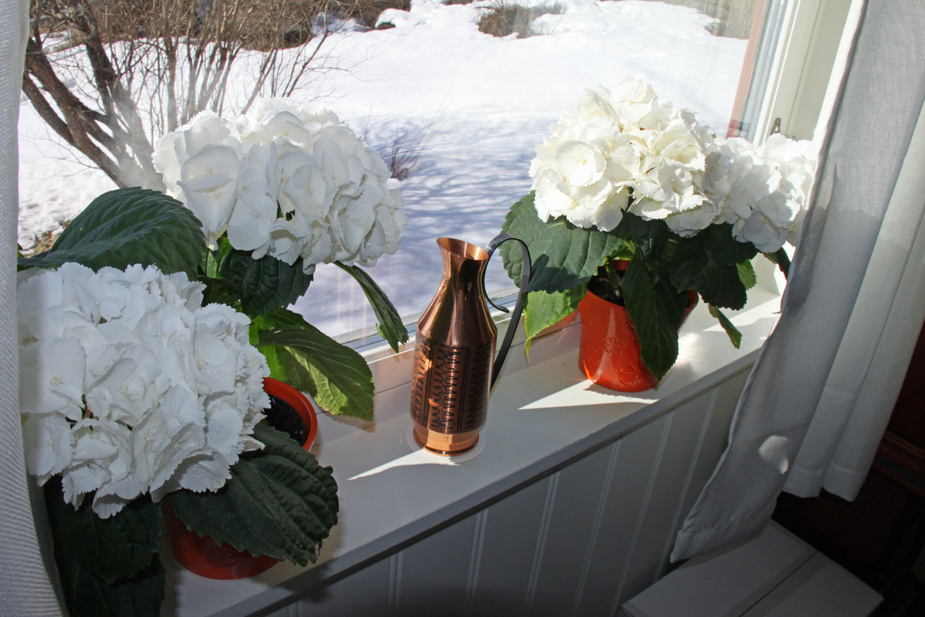 Jeg hadde kjøpt to flotte hvite Hortensia med tre store blomstergrener hver. De hang alt for fort med hodet. Så til slutt måtte jeg klippe av en av blomstergrenene på hver av plantene, og da klarte jeg å holde dem forholdsvis friske og fine ved å sette dem i vann hver kveld.