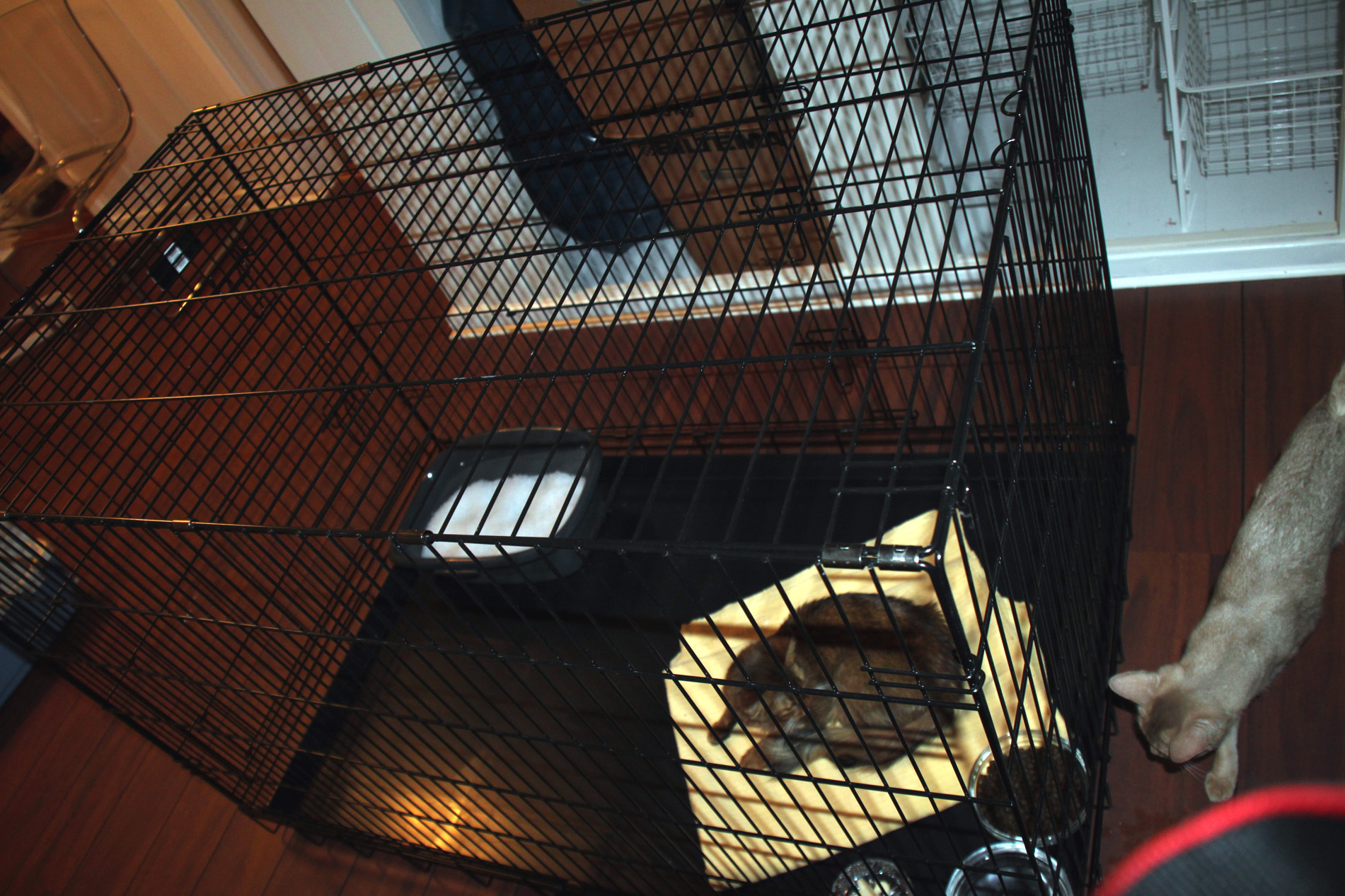 Nå er hun hjemme og må sitte i bur i 6 uker! Det er nesten verre enn operasjonen synes jeg. En somali er svært spretten og fjærlett og liker godt å hoppe høyest mulig opp, gjerne fra gulvet og helt opp på høye skap. Men det får hun altså ikke lov til. Hun skal ikke hoppe og belaste beinet før det er skikkelig grodd, og det tar 6 uker…