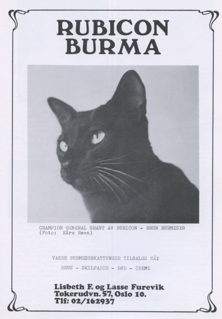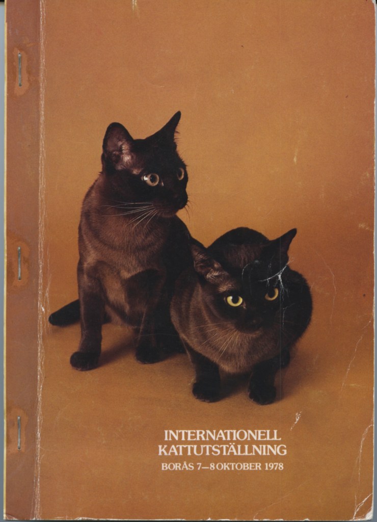 Boråskattens utstilling 1978 Jeg har spart på en katalog fra Boråskattens utstilling 7.-8. oktober 1978, der vi deltok med flere burmesere. Det deltok 44 burmesere på denne utstillingen, hvorav 38 var brune! De andre fargene var tre blå, en sjokolade, en creme og en blåcreme (min Rubi). Det totale antallet påmeldte katter var 671. Forsiden på denne katalogen var et flott bilde av to brune burmesere fra Bam-Bam’s oppdrett. Gert Boström var den gang sekretær i Boråskatten.
