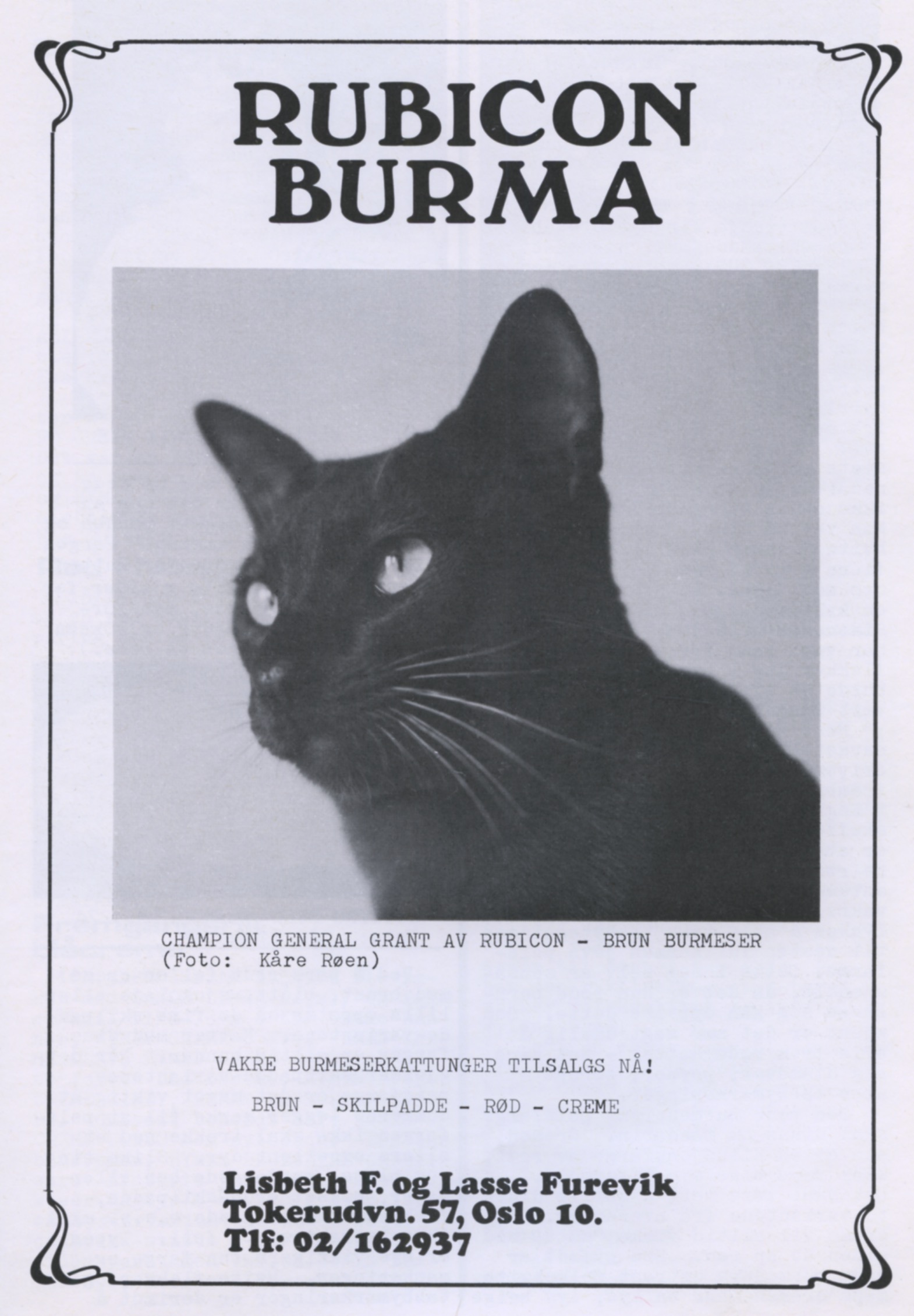 Burmeseren har alltid hatt en spesiell plass i mitt hjerte. Burmeseren er en eksotisk og orientalsk rasekatt med en spennende historie. Jeg hadde oppdrett av burmesere mellom 1977 og 1987. 62 burmesere så dagens lys under Rubicon-stamnavnet den gangen. Den siste burmeseren min døde i 1997, Petra Pus av Rubicon.