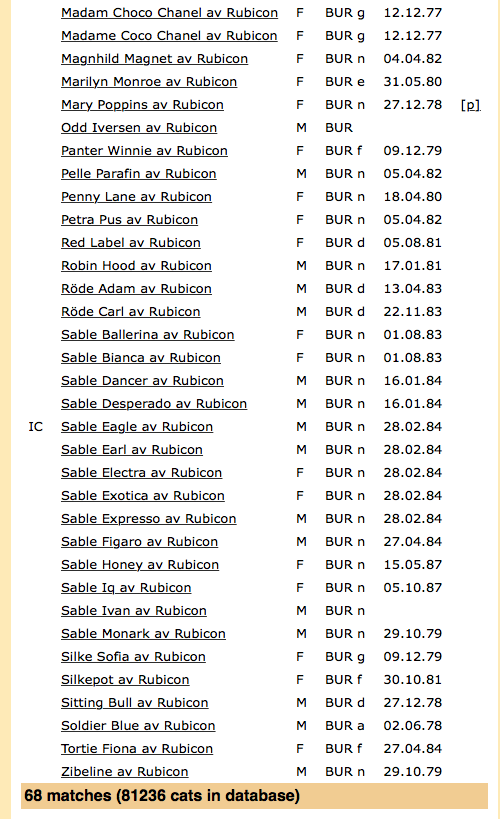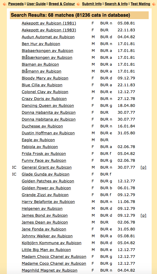 Import fra USA Sammen med Boström importerte vi en brun hannkatt fra USA. Han måtte stå tre måneder i karantene i Sverige før han kom hjem til oss. Dessverre levde han bare noen få uker etter ankomst til Norge. Han syknet plutselig inn og døde fra oss. Den gang forsto vi ikke helt hva som feilte han, det ble snakket om lungebetennelse, men nå i ettertid når jeg har studert et omfattende brev jeg skrev til Norges Veterinærhøgskole der jeg beskrev forløpet, forstår jeg at det han trolig døde av var FIP. Påkjenningen med den lange reisen, opphold i karantene og så til slutt flytte til Norge ble antakelig for mye for han. Den gang var ikke kjennskapet til FIP så godt, men jeg ser av beskrivelsen at kattens ene lunge og brysthule var fylt med væske.