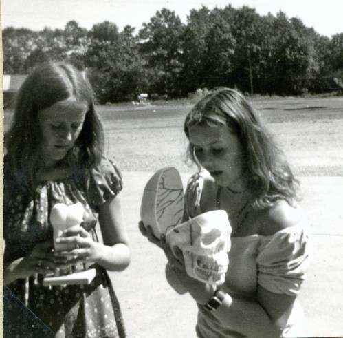 Jeg (til høyre) prøver å kommunisere med hodeskallen under undervisning i anatomi på Asker yrkesskole, tannlegeassistenlinjen, Føyka i Asker i 1973. Liv Gramel står til venstre på bildet.