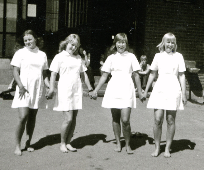 Fra venstre: Lisbeth Falling, Rigmor Abelsen, Idun Wolter og Gerd Eikaas. Er vi ikke søte? Vi var det aller første kullet som gikk tannlegeassistenlinje på Asker yrkesskole 1972/73.