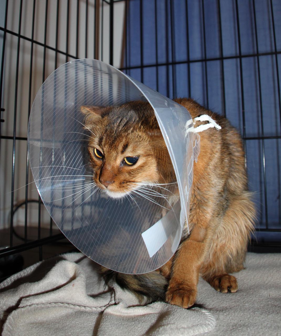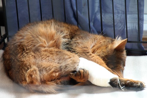 Så ble hun satt i buret igjen med skjermen på. Av en eller annen grunn ble Lille Puma, som nå har kattunger, skremt opp av ett eller annet og gikk til angrep på buret der Madonna satt! Madonna ble kjemperedd og skvatt forskremt rundt i buret, sølte ut vannet sitt og – da jeg kom opp for å sjekke hva som hendte, så jeg blod på teppet! Hun hadde klart å brekke beinet tvers av igjen – det hang og dinglet…