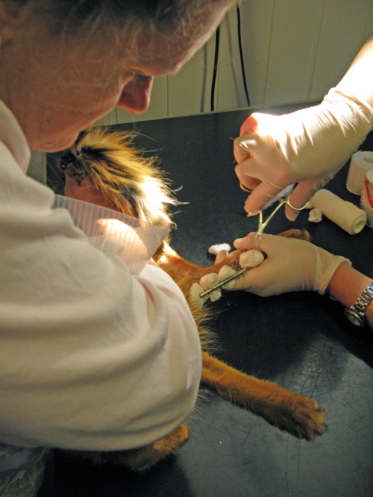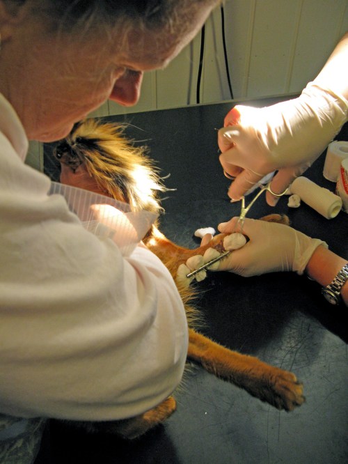 Da hadde jeg ikke annet valg enn å ringe til dyrlegen, og vi reiste i løpet av kort tid, og hun fikk en sprøyte og sovnet inn i armene mine. Det ville ikke være forsvarlig å operere henne enda en gang og la henne sitte innestengt i bur i mange, mange uker til. Dessuten, så viste det seg vel også at beinet trolig var for svakt, at det før eller siden likevel lett kunne ha brukket på nytt.