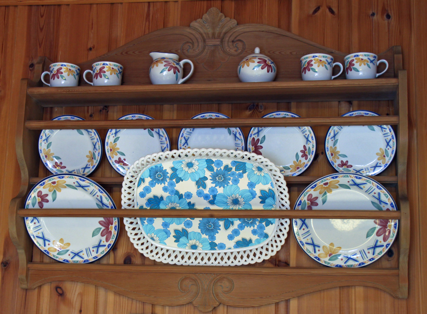 Merket med blomster, flower-power, kjøkken, servise, tallerkenhylle, trehvit
