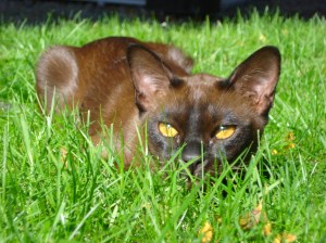 CH Romantica av Rubicon, viltfarget somali, koser seg ute i hagen sin om sommeren, uten å stikke av.