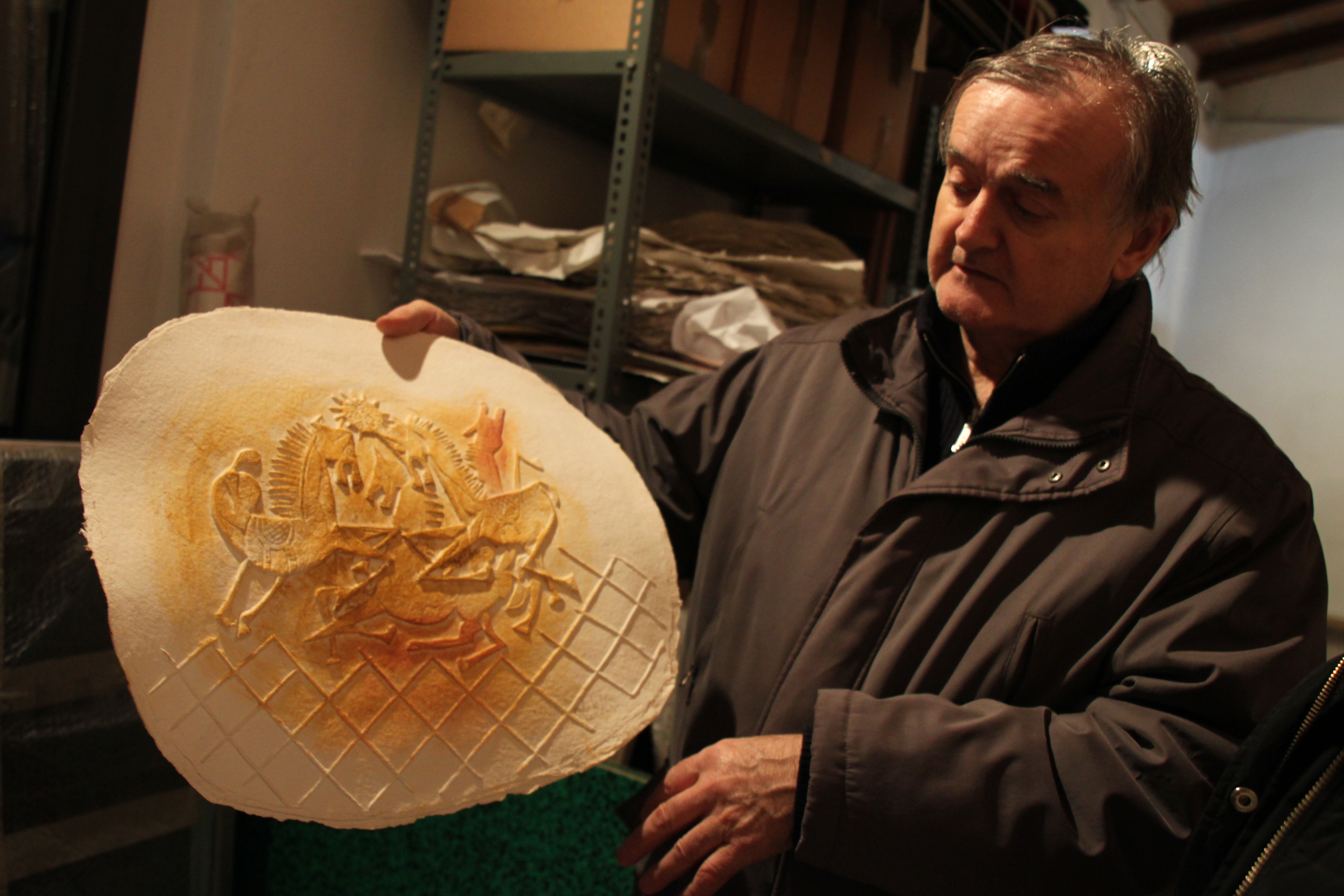 Marche, and some shown exclusively by Marcello Palma in Italy. Than, Australians, Coreans, Vietnamese, Uruguayans (Pablo Atchugarry), French and Dutch, a big family of artists who in Saliceto di Alseno have their place. Besides modern painters, Palma Arte shows regularly the art of Mario Schifano, Domenico Cantatore, Mino Maccari, Domenico Purificato, André Masson and original and graphics works on paper of the giants of the XIX century, such us De Chirico, Carrà, Guttuso and Alinari. Speaking of paper, even the white sheets are of best value. They are extra pure, hand made, cottonsheets, 379231_10151424605881171_1970899193_nMarcello Palma native of Fabriano orders from the worlds best papermakers in Fabriano. On this type of paper, the drawing, inks and acquarelles of the Palma Arte become precious originals, fascinating artist cahiers. Stamped with low-reliefs in cellulosis, many sheets loose their bi-dimensional character and become half painting, half sculpture.»