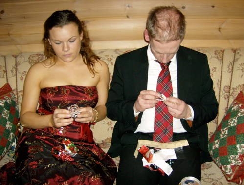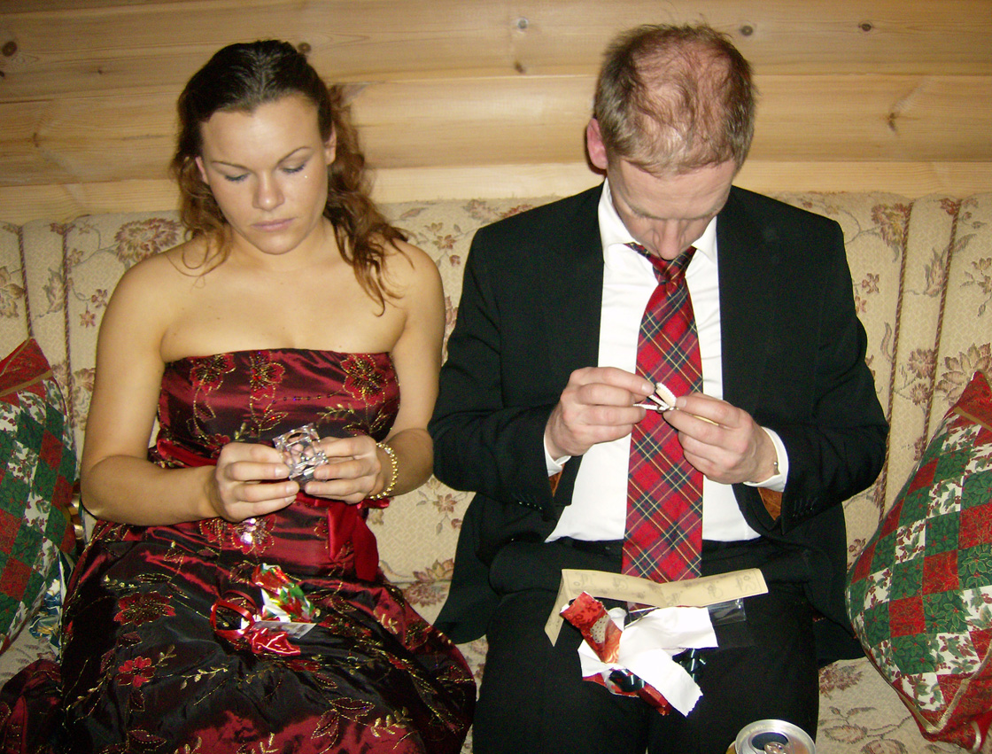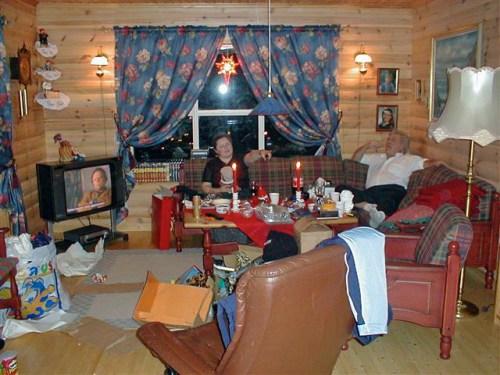 Kvinnen måtte lage alle klærne til barna selv, og hun hadde spesielt mye å gjøre til jul. Da skulle alle ha nye klær og det måtte strikkes og sys omtrent døgnet rundt. Siden det var krig, så var det jo vanskelig å få tak i gode stoffer og garn, så mye måtte sprettes opp og syes om fra hennes egne klær eller avlagte fra barna som vokste ut av det de hadde.