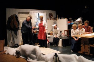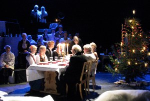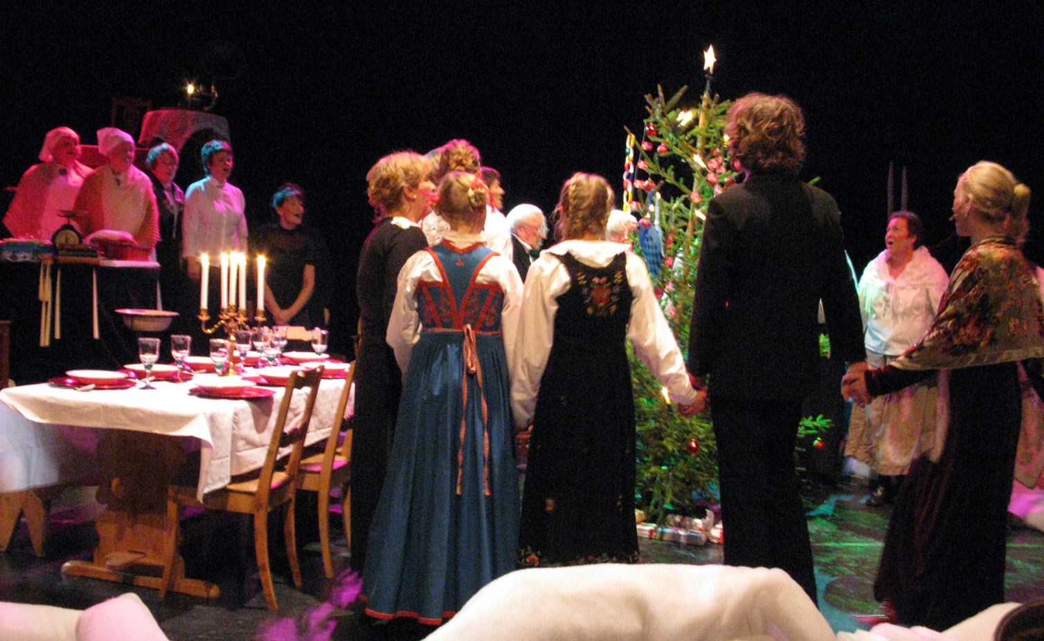 Scenen sydet av folk i alle aldre, her var det mange amatører som deltok, sangere, musikere, dansere, bakstekjerringer og andre. Sammen skapte de en svært koselig julefortelling om en familie som feiret jul i gamle dager. Det var mange aktiviteter på scenen samtidig, til og med lefse- og kakebaking. Publikum fikk smake julekaker i pausen.