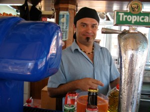 De går langs bordene på utekafeer og prøver å prakke på turistene sine varer.