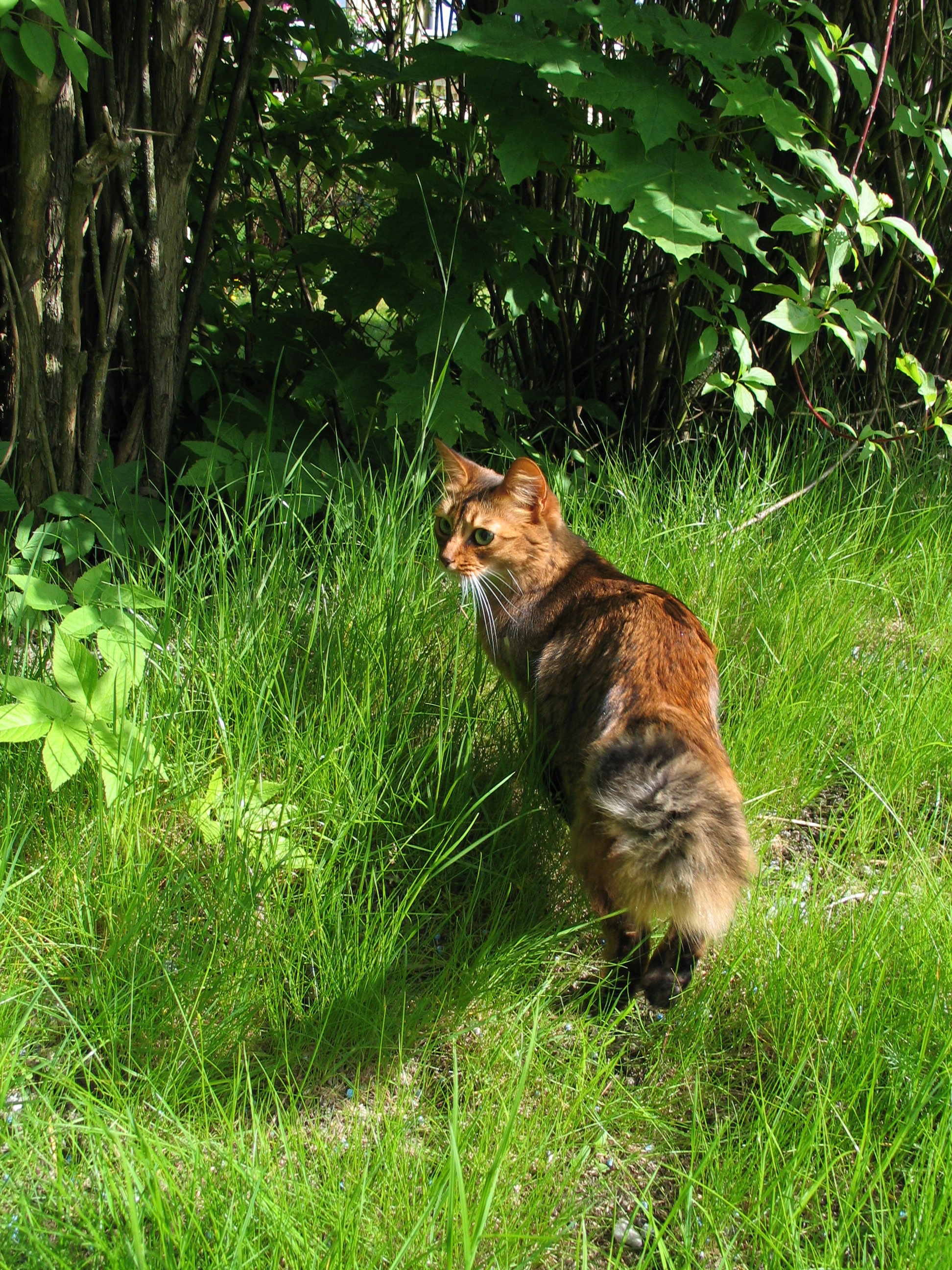 CH Romantica av Rubicon, viltfarget somali, koser seg ute i hagen sin om sommeren, uten å stikke av.