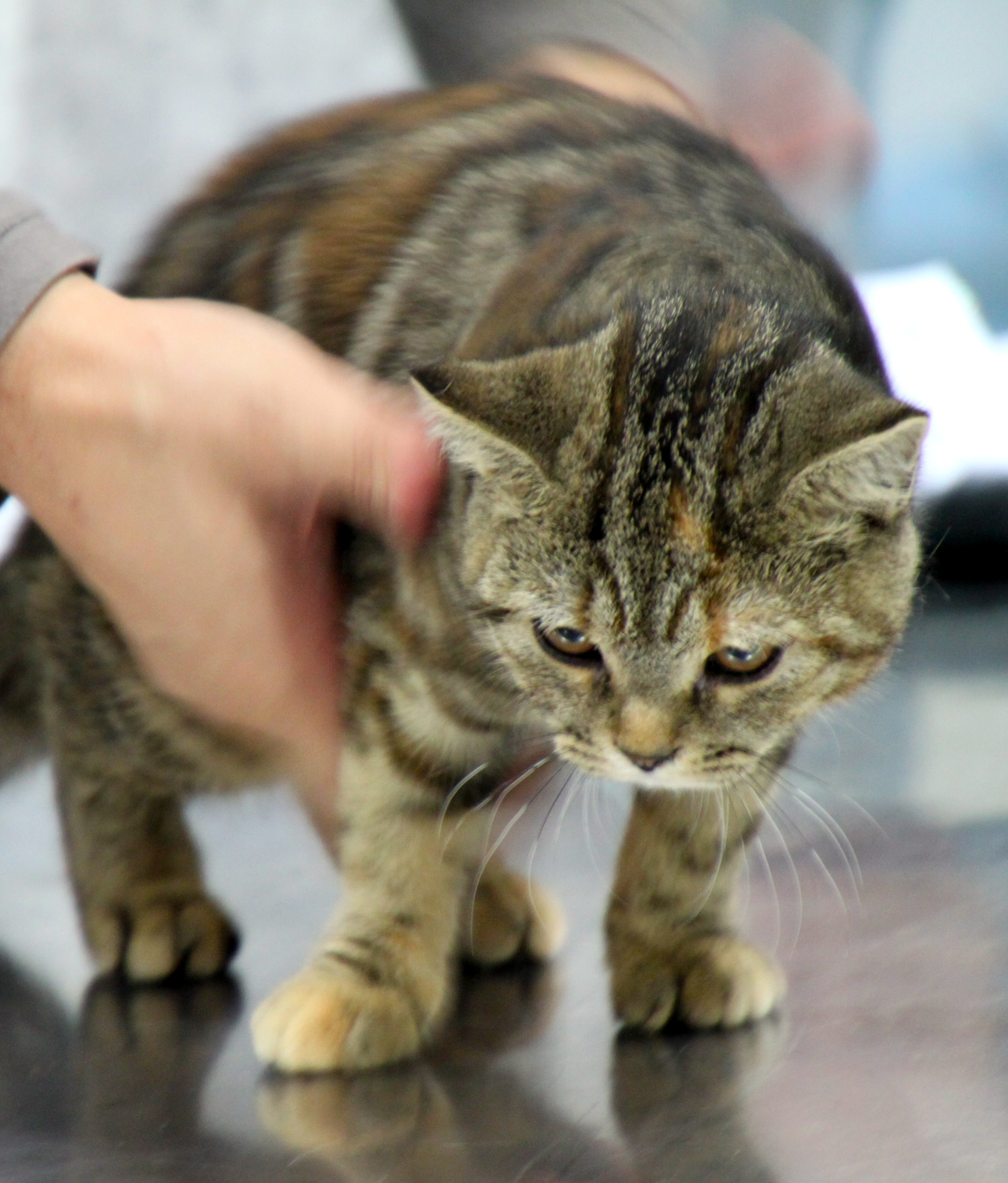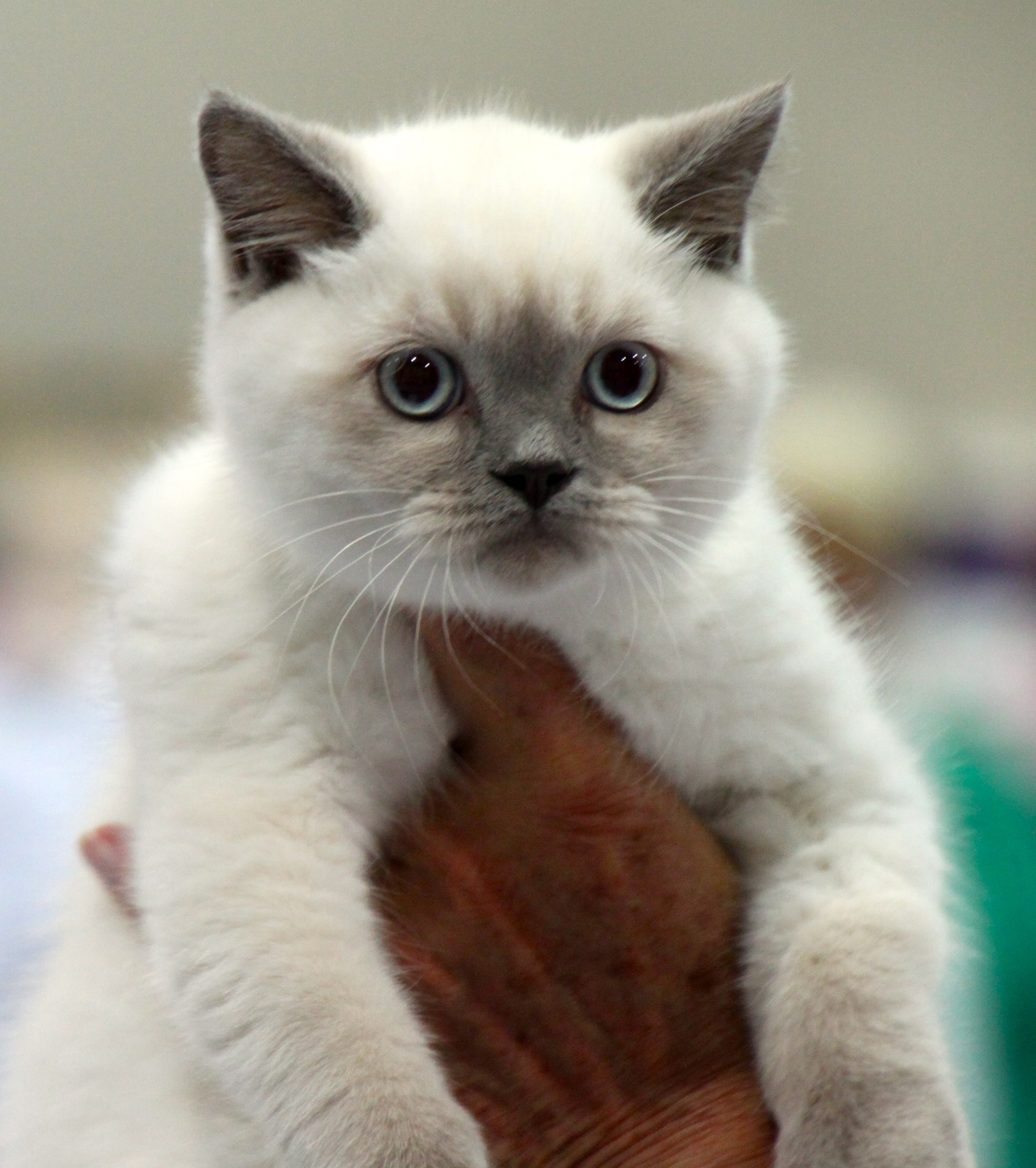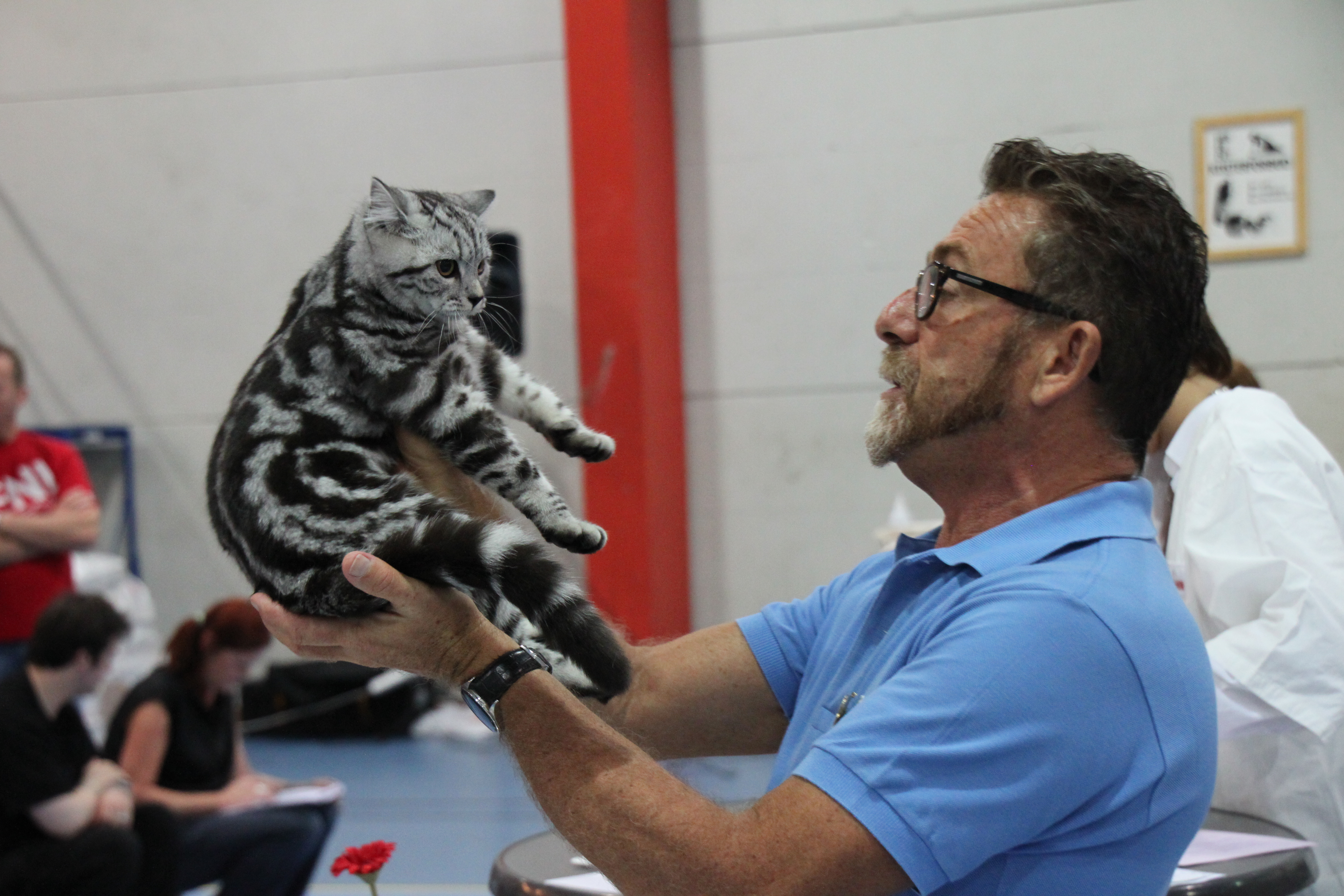 En britisk korthårs kattunge blir bedømt på utstilling. Fargevarianten er klassisk sølvtabby