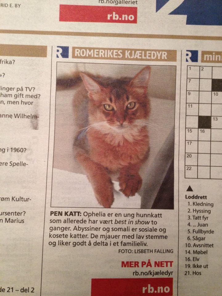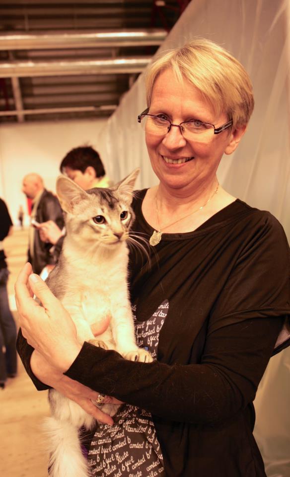 Det ble også en meget spennende utstillingsreise til Helsinki sammen med Lene. Hun stilte ut sin vakre sortsølv somali Pernille og jeg hadde med Dragonfly. Sistnevnte måtte se seg slått to ganger av finere somalihanner, mens Pernille gikk helt til topps og fikk sine sertifikater og ble bl.a. katten med best somali look! Det var virkelig en hyggelig og lærerik tur, der også Linda Kristin Ortang deltok med sine ocicat’er. Lene og Linda Kristin – dere får ha meg unnskyldt for ikke å oppgi helt nøyaktige resultater, men jammen hadde vi det gøy!
