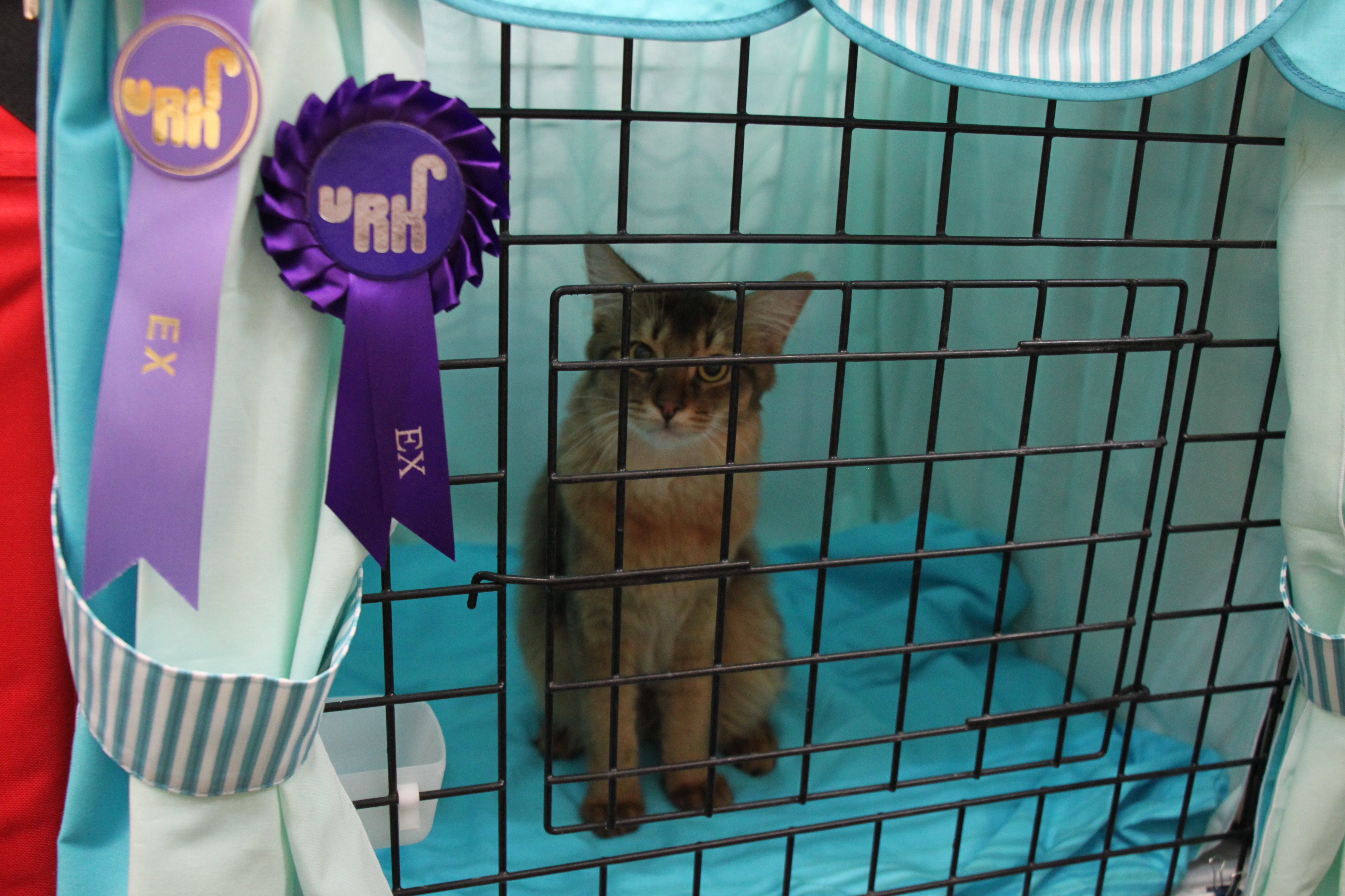 Fine Dragonfly med Marius-genser på Adelkattens juleutstilling 2013. Dragonfly var opprinnelig tenkt som avlshann, men så hadde han gen for PRA, akkurat det samme som Janis. Disse to skulle utgjøre et nydelig par, men slik ble det altså ikke. Jeg tenkte også at han kunne pare Wera av Rubicon, min fawnsølv abyssinervariant. Hun fikk løpetid, men dessverre greide han ikke å pare henne før kastraten Pegasus tok over, og derved ble det ikke noe… Siden Dragonfly ble meget ivrig på å markere ble han heller raskt kastrert. Han er verdens skjønneste somaligutt med verdens beste gemytt.