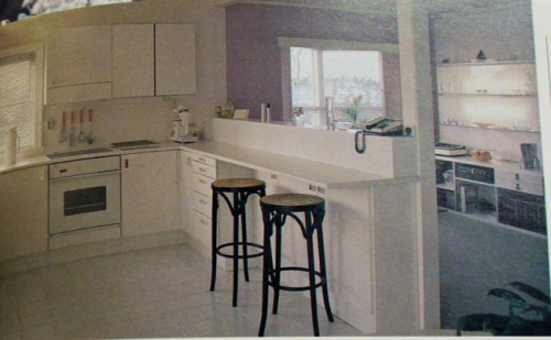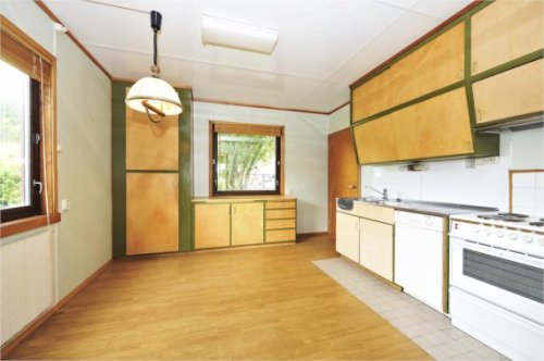 Kjøkkenet i huset er kvadratisk med to store vinduer på to av veggene, og dør fra gangen. Det blir stor åpning inn til stor spisestue. Rommet gir oss noen utfordringer vedrørende antall overskap, og plassering av hvitevarene.