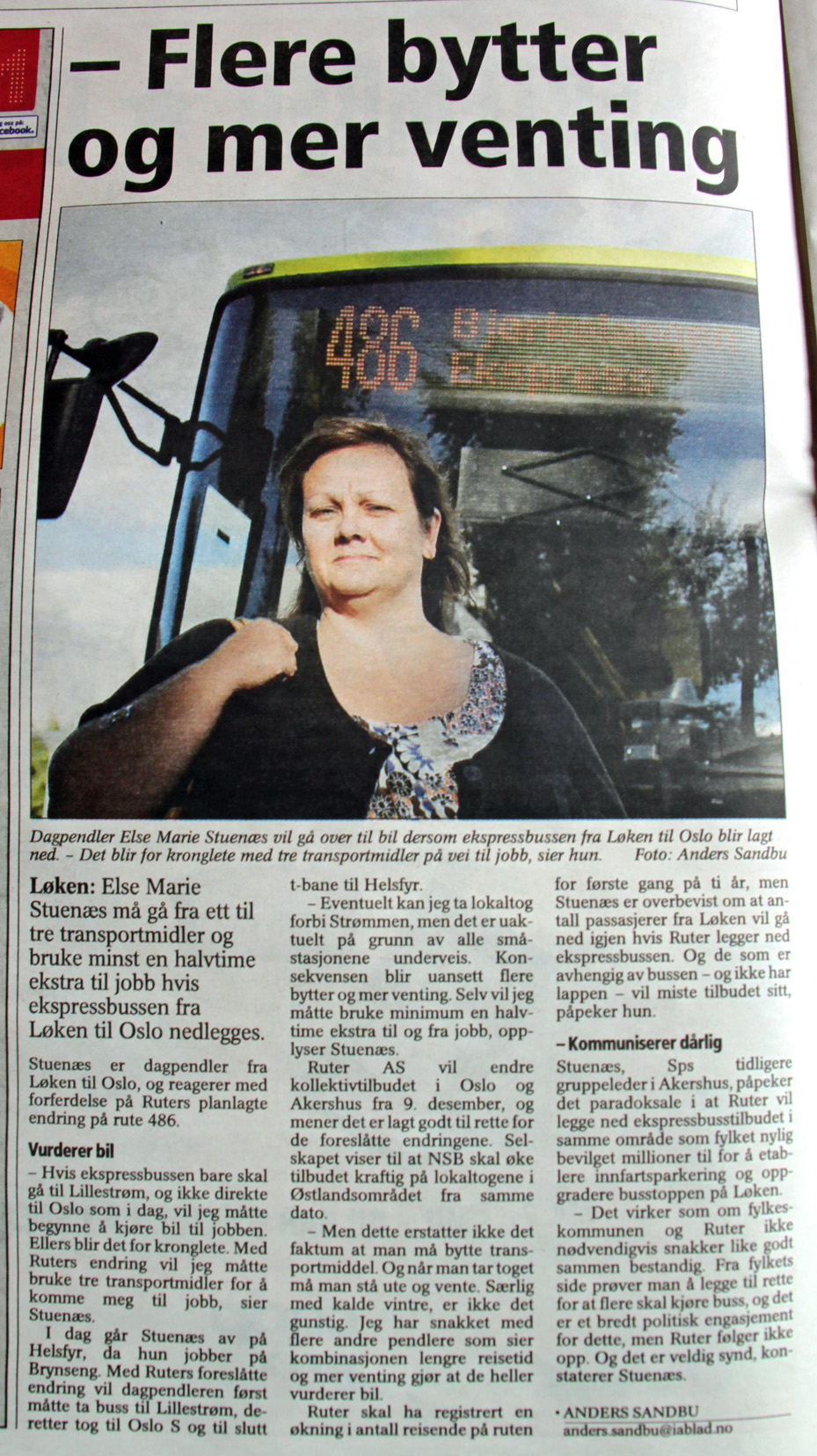 Konsekvensen vil være at de fleste pendlere som bor lengst vekk på denne ruta, blir nødt til å kjøre bil; altså bli sittende i bilkøer og øke det store presset på veinettet! Dette må da være imot enhver logikk og tanke på miljøet?