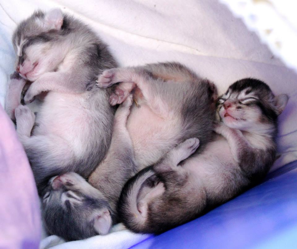 De dier og sover stor sett hele tiden. De er runde og fine i magene sine og hovedoppgaven er å bare vokse seg større. Mammakatten, Leki, passer på som en smed, og er kjempestolt av ungene sine.