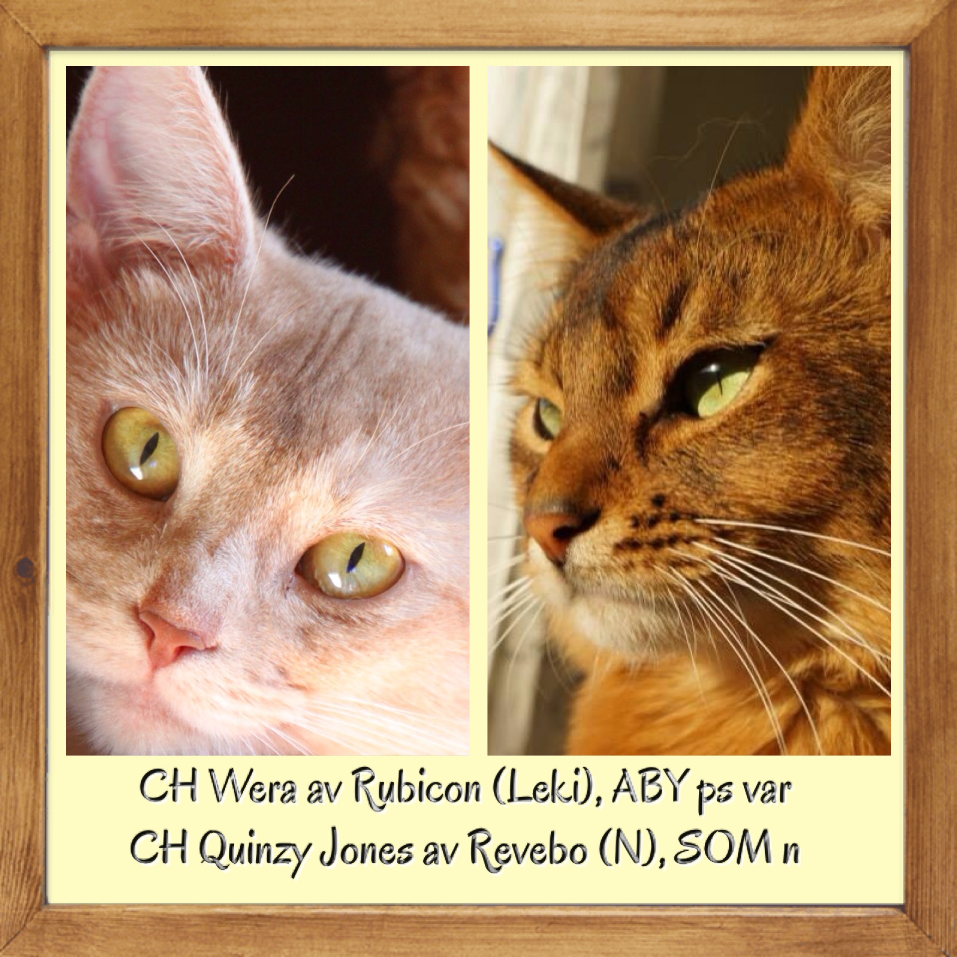 Sølvkatten min Siden Ophelias kull skal bo hos fôrvert, så har tanken på enda et kull vokst fram. Vanligvis har jeg kun ett kull i året, men nå kan jeg jo også ha et kull her hjemme 🙂 Wera av Rubicon3Wera av Rubicon, også kalt Leki, er en fawnsølv abyssinervariant. Hun hadde kull ifjor med CH S*Helinka’s Pegasus, viltfarget abyssiner variant. Fire flotte unger ble det, hvorav to med sølv; Alfonzino av Rubicon, svartsølv somali, og Amazing Grace av Rubicon, fawnsølv abyssiner som sin mor. Planen var opprinnelig at Leki skulle pares med en fawn abyssiner, Donald av Simonstad. Hun var der på besøk hun, men noen skikkelig paring ble det visst ikke, så hun kom hjem igjen med uforettet sak. Da ble det Pegasus som fikk prøve seg på henne. Kattungene ble veldig flotte, men svartsølven har vist seg nå som han vokser til at det dessverre har blitt litt rufisme. Alfonzino får utrolig flotte bedømmelser og han er ofte med i konkurransen om NOM på utstilling, men som sagt er denne rufismen blitt litt tydeligere.