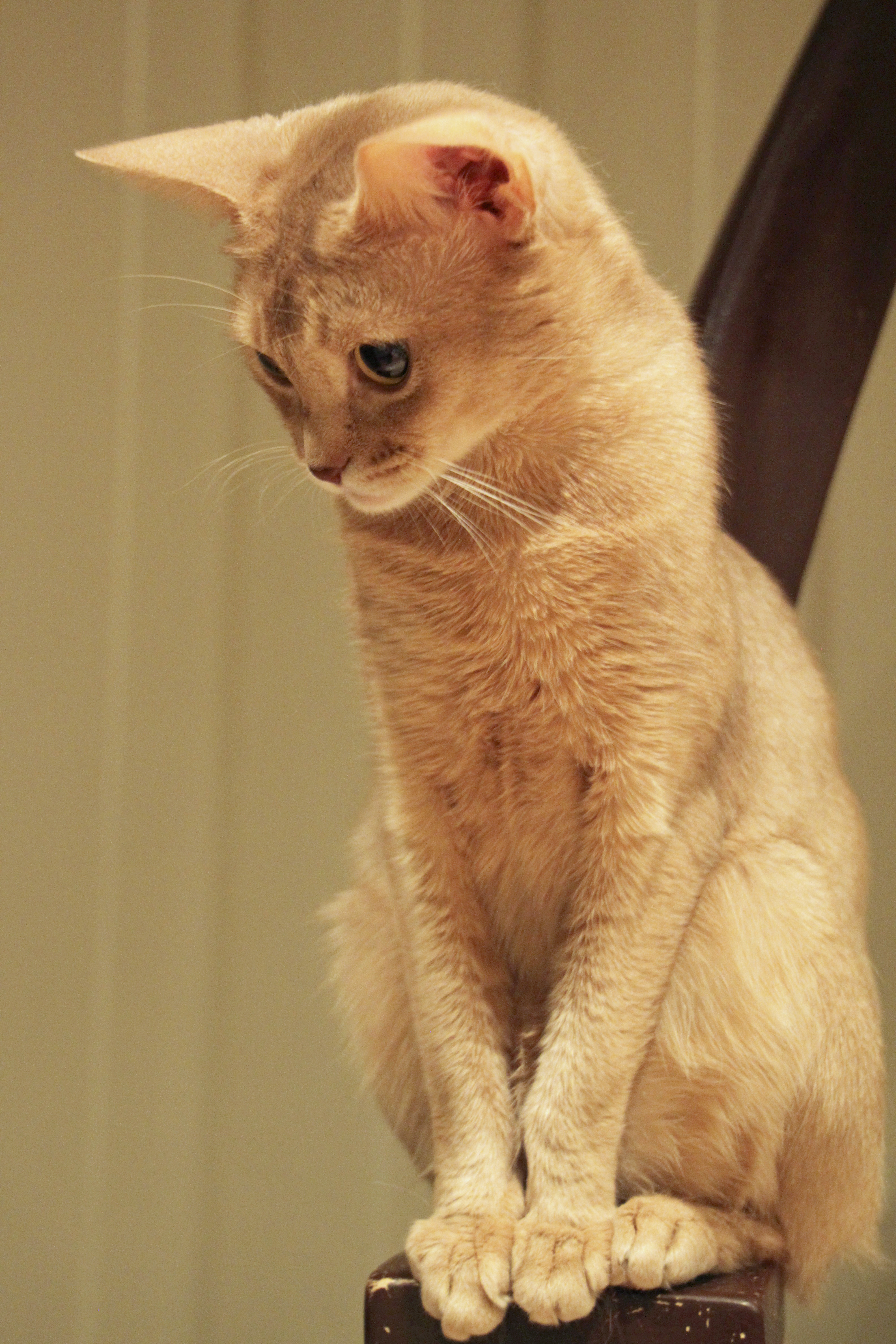 Fawn abyssiner hunn til salgs: Hun er svært lovende i typen, nydelig hodefasong, og fantastisk flott øreplassering. Hun er helt jevn og fin i fargen, uten synlige markeringer på bena eller på halsen. Hun er ganske mørk i fawn-fargen. Hun har kortest pels av kattungene i kullet, og hun kan være uten gen for langhår. Jeg skal ta DNA-test for langhårsgenet. Dersom hun ikke har dette genet kan hun bli et spennende innslag i abyssineravl. Vanligvis bruker vi bare variantene kun mot somaliavl.